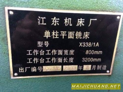 单柱平面铣床X338-1,江东机床,全新库存 工作台尺寸:3200*800 工作台纵向行程:2500mm 工作台面至床身底面高度:860mm 主轴套筒直径:250mm 主轴箱垂向行程:850mm 主轴轴线至工作台最小距离:50mm 机床净重:19T